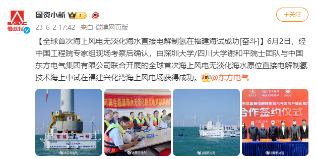 [国资小新]全球首次海优势电无淡化海水直接电解制氢在福建海试乐成